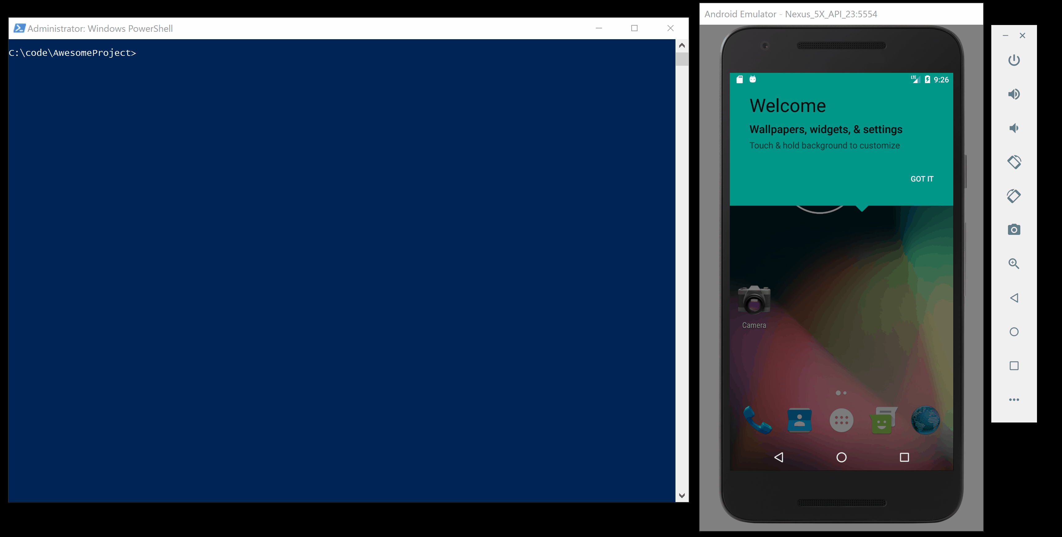 In Android Virtual Device Manager, click on the Play button of the Virtual Device that we created earlier. This will spin up a virtual Nexus 5X with Marshmallow on it.